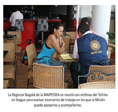 | MESA DE VICTIMAS, CON EL AOCMPAÑAMIENTO DEL DOCTOR ANTONIO OROPEZA,DELGADO DE LA MISION DE APOYO AL PROCESO DE PAZ DE LA O.E.A. MAPP-OEA. IBAGUE TOLIMA COLOMBIA |